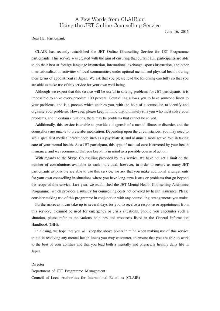 At the 2015 PA Conference, CLAIR announced a new online counseling service. This free counseling service works outside of CLAIR and JET. They offer two types of counseling: Web Mail Counseling and Skype Counseling